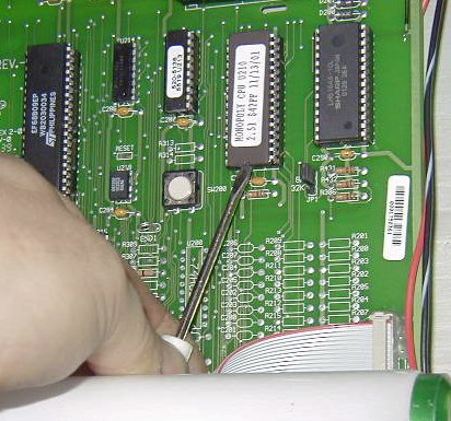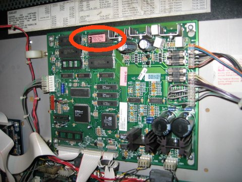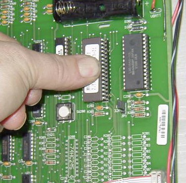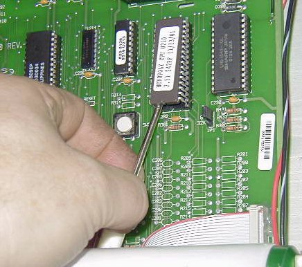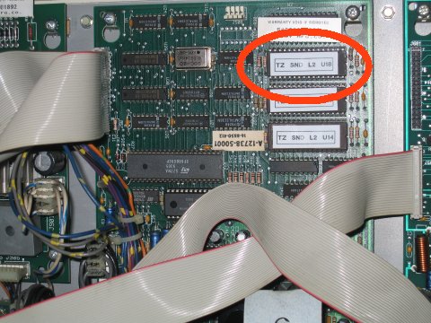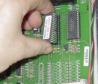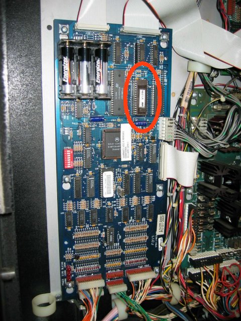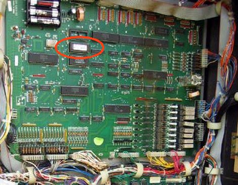 het CPU bord bevindt zich 1 enkele eprom. Deze eprom dient verwijderd en meegebracht te worden indien je de kast wilt updaten. Merk op dat er in het midden van de