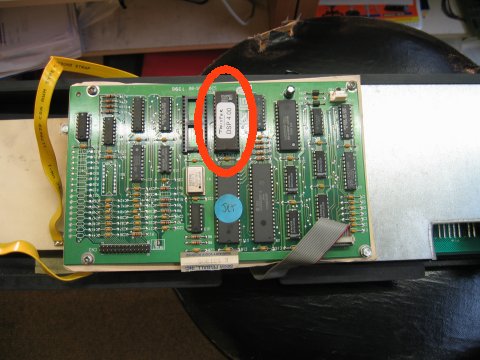 het audio/video bord bevinden zich maximaal 6 eproms. Slechts 1 hiervan hoeft te worden meegenomen voor een eventuele update. Op deze foto zie je in de rode cirkel de eprom zitten waar het om gaat, de overige programmachips zitten ernaast en zijn in dit geval niet eens te wijzigen. Het updaten van de soundsoftware is overigens slechts in enkele gevallen nodig. |