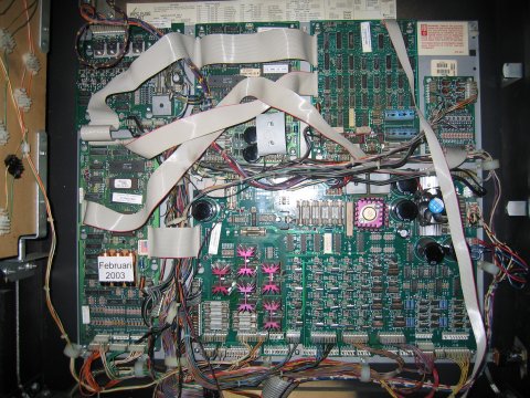 je de grote print in een Williams system 11 kast. Links bovenop de print zitten nog twee eproms, deze zijn voor het geluid en kunnen blijven zitten. Let op de WITTE